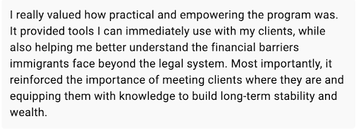 We also provide immigrant-centered financial empowerment and wellness training for individuals and families, financial professionals, and organizations with multicultural teams.